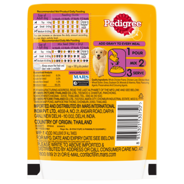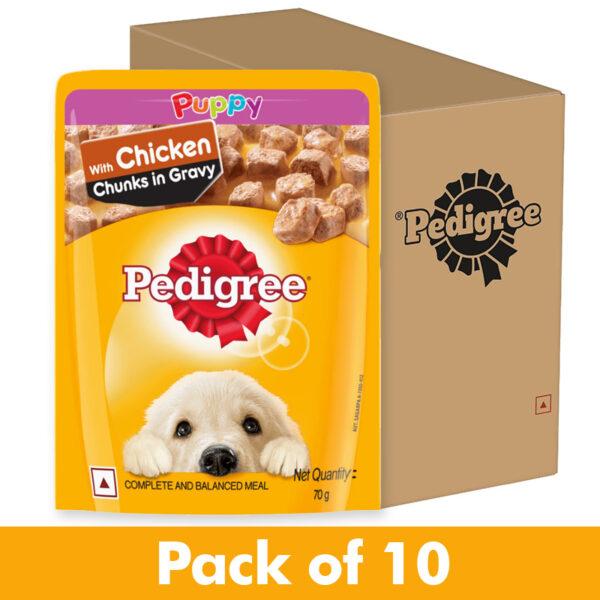 Choose Pedigree Puppy Wet Dog Food – Chicken Chunks in Gravy Pouch to give your puppy a flavorful and nutritious meal. With Pedigree, you can trust that you are providing them with the nourishment they need to grow into happy and healthy adult dogs.